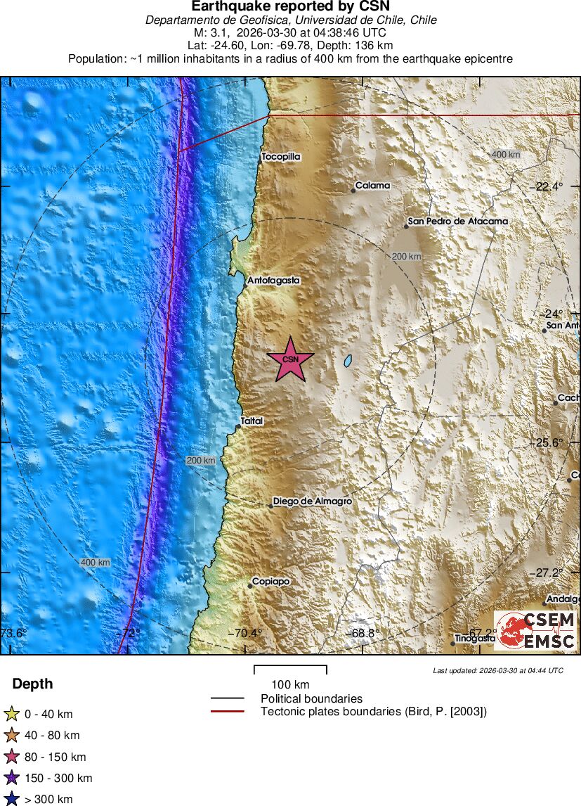 | 2.9 | 81.4 | 4948 | 22:29 | Linkki | Pieni maanjäristys- TARAPACA, CHILE - Eilen |