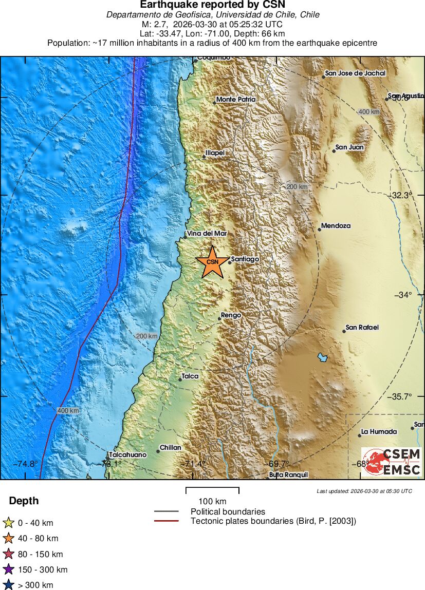 | 2.7 | 65.5 | 5738 | 23:25 | Linkki | Pieni maanjäristys- REGION METROPOLITANA, CHILE - Eilen |
