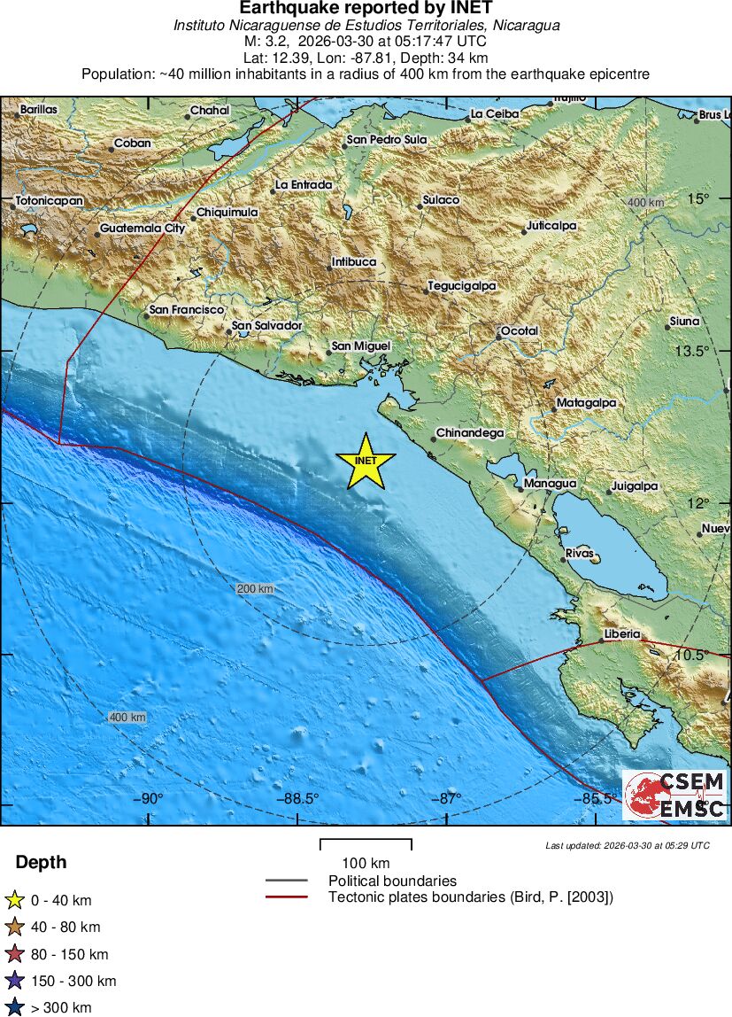 | 3.2 | 34 | 2382 | 23:17 | Linkki | Pieni maanjäristys- NEAR COAST OF NICARAGUA - Eilen |