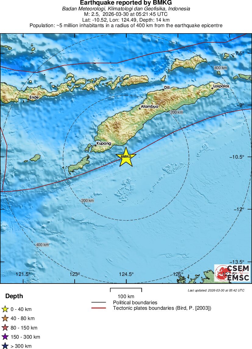 | 2.5 | 14 | 8765 | 23:21 | Linkki | Pieni maanjäristys- TIMOR REGION, INDONESIA - Eilen |