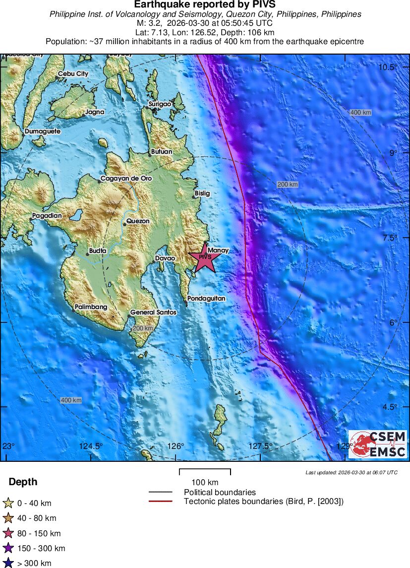 | 3.3 | 4 | 7628 | 22:20 | Linkki | Pieni maanjäristys- MINDANAO, PHILIPPINES - Eilen |