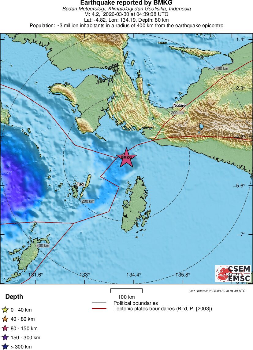 | 4.2 | 80 | 8027 | 22:39 | Vezu | Lagan zemljotres- NEAR S COAST OF PAPUA, INDONESIA - Danas |