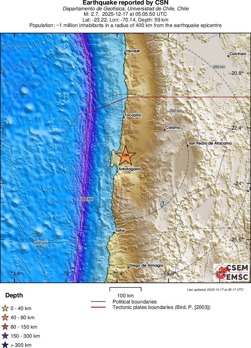 | 2.7 | 58.6 | 5109 | 22:05 | Link | Minor Earthquake- ANTOFAGASTA, CHILE - Today |