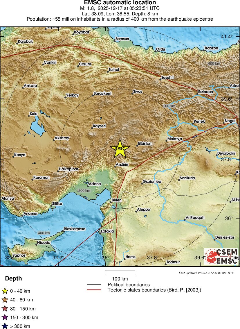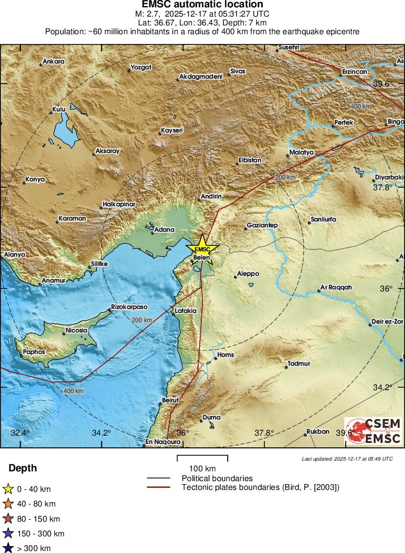 | 2.7 | 7.3 | 6314 | 22:31 | Link | Minor Earthquake- TURKEY-SYRIA BORDER REGION - Today |