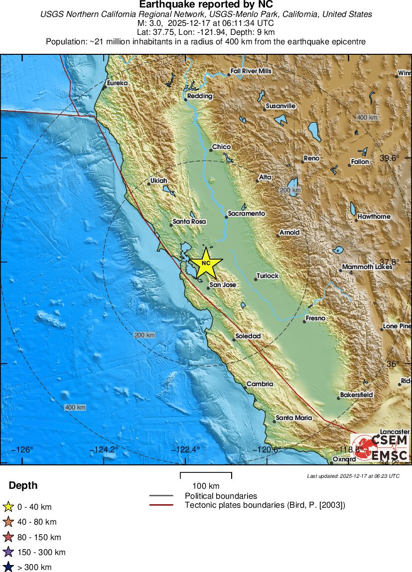 | 2.9 | 9 | 1058 | 23:11 | Link | Minor Earthquake- SAN FRANCISCO BAY AREA, CALIF. - Today |