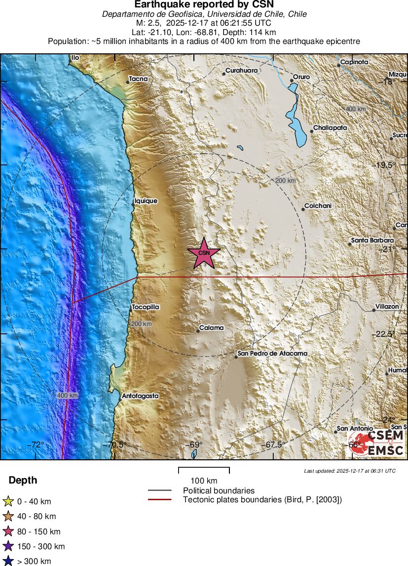 | 2.5 | 114.2 | 5011 | 23:21 | Link | Minor Earthquake- TARAPACA, CHILE - Today |